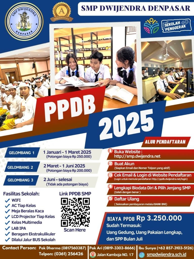 Pendaftaran penerimaan siswa baru sudah dibuka untuk tahun pelajaran mendatang yaitu 2025/2026. Orang tua siswa kelas VI SD supaya membantu putra-putrinya untuk mendaftar di SMP Dwijendra Denpasar dengan mengklik link berikut https://smpdwijendra.web.id. atau dapat langsung mengakses link https://ppdb.dwijendra.net/ Ayo buruan karena kuota terbatas. Jeg pasti SERU !!!